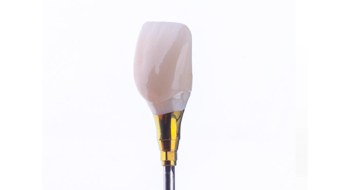 Pracownia techniczna, z którą współpracujemy – Goldlab – dopracowała idealny system połączenia elementów precyzyjnych. Pierwszym elementem jest łącznik indywidualny tytanowy, dopasowany do kształtu wygojonego dziąsła. Korona, która jest sklejona z łącznikiem, zaczyna się wysoko wypolerowanym tlenkiem cyrkonu – jest to materiał wysoce biokompatybilny, co zapewnia brak problemów z dziąsłem.